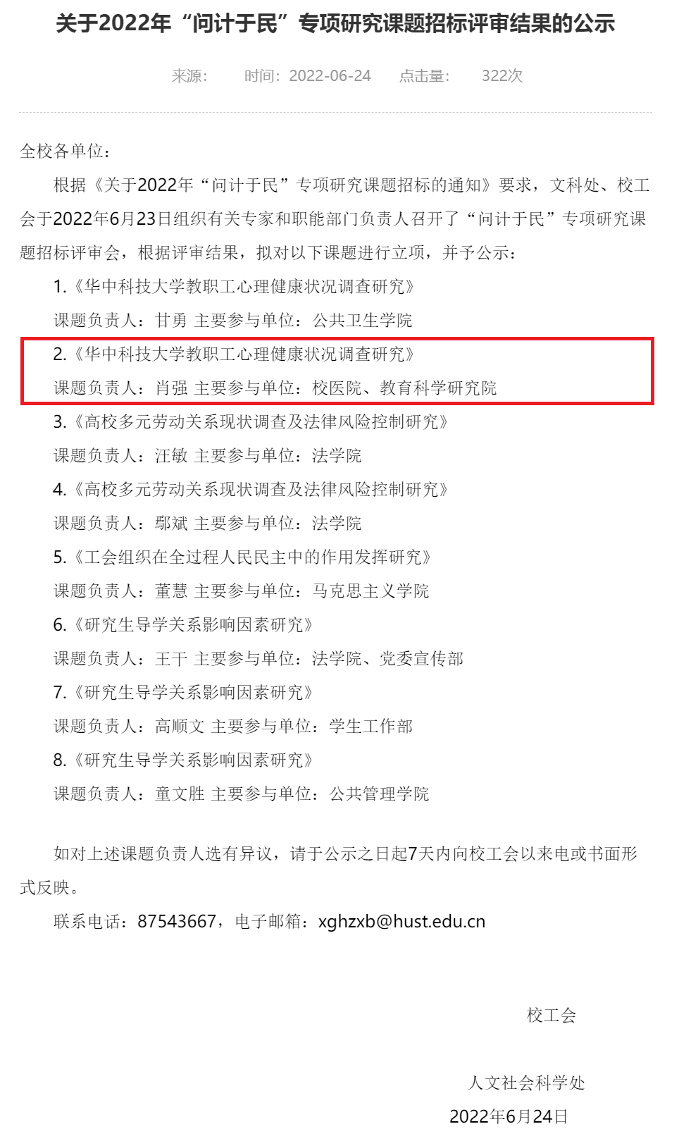 近日,华中科技大学工会委员会公布了2022年“问计于民”专项研究课题招标评审的结果。校医院申报的“教职工心理健康状况调查研究”项目成功立项!